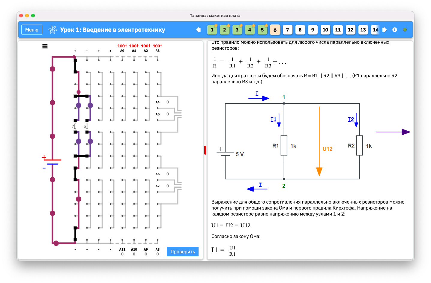 Идущее в комплекте программное обеспечение автоматически выдает ученику задания и проверяет правильность сборки.